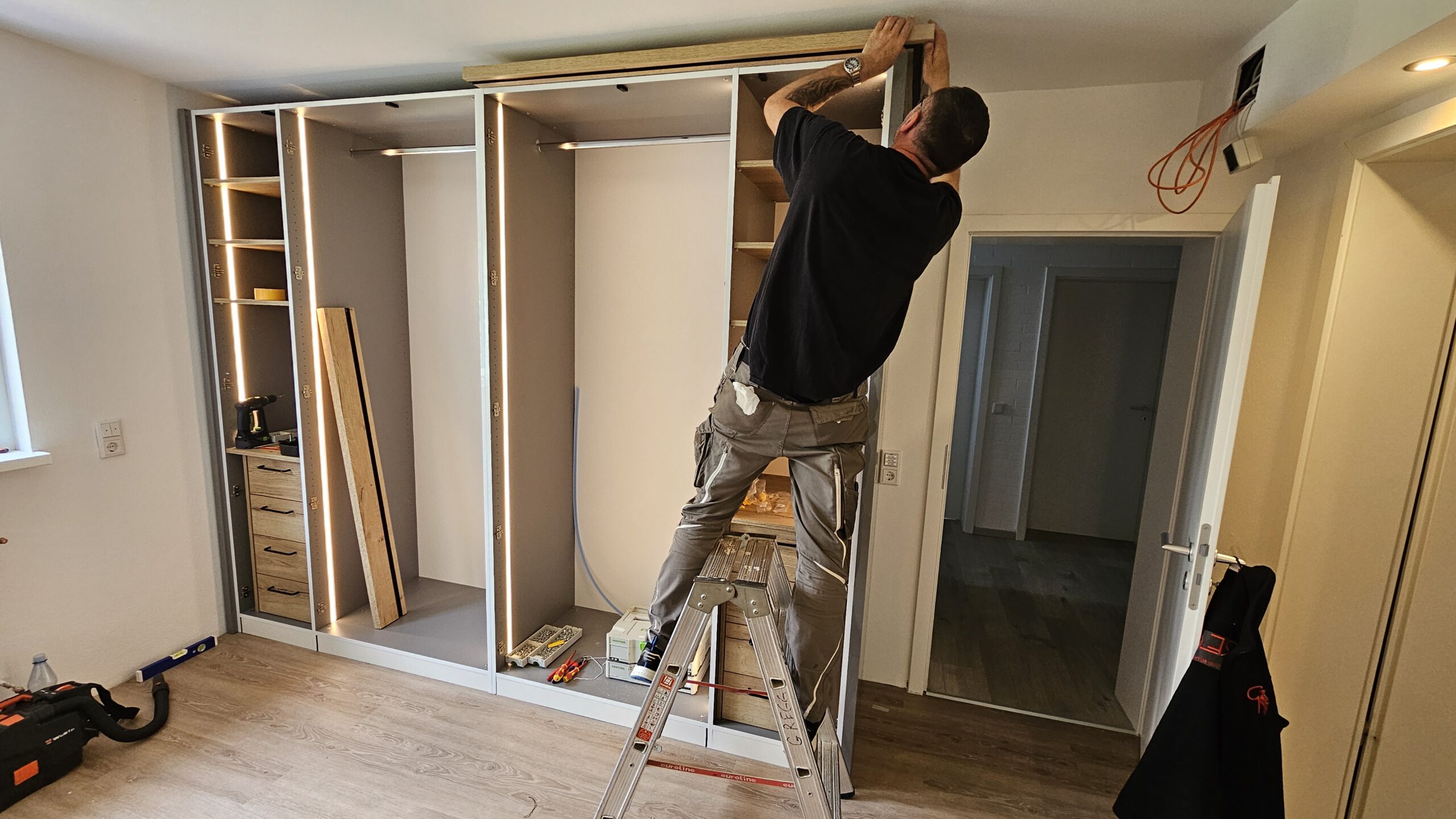 Wir planen Ankleiden aus dem Raum heraus. Schräge Wände, Nischen oder begrenzte Flächen werden dabei genauso berücksichtigt wie vorhandene Durchgänge oder Anschlüsse. Offene und geschlossene Elemente werden so kombiniert, dass Übersicht entsteht und alles seinen Platz hat.