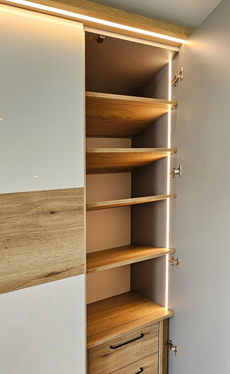Maße, Fachhöhen und Aufteilungen richten sich nach dem tatsächlichen Bedarf. Kleiderstangen, Böden, Schubkästen oder Auszüge werden auf Maß gefertigt und so angeordnet, dass Übersicht entsteht und alles gut erreichbar bleibt. Offene und geschlossene Elemente lassen sich dabei kombinieren.